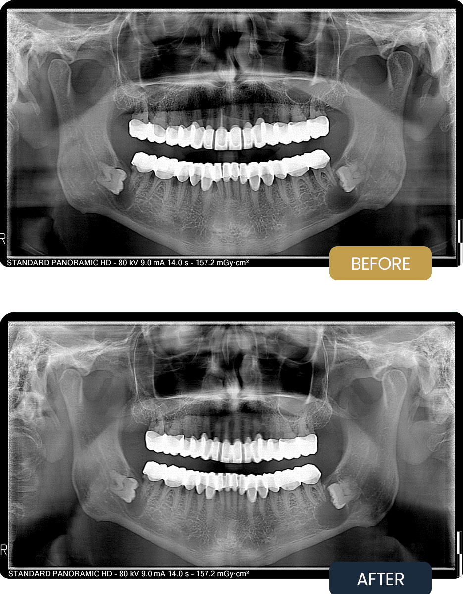 Post treatment panoramic imaging confirmed stable, well seated zirconium crown restorations across both arches, with repaired and replaced crowns in the upper jaw. Improved occlusal alignment and crown integrity were observed.