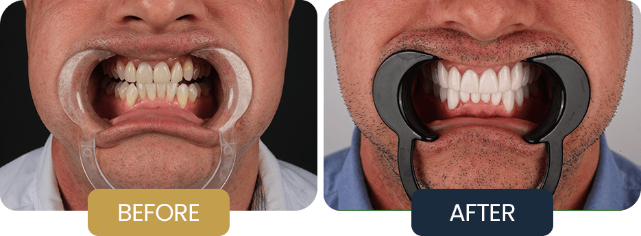 Ashley initially received comprehensive restorative treatment in January 2024 at another clinic, involving full arch zirconium crown restorations. In December 2025, he attended our clinic as an aftercare patient due to functional concerns in the upper jaw and fractures affecting several crowns.