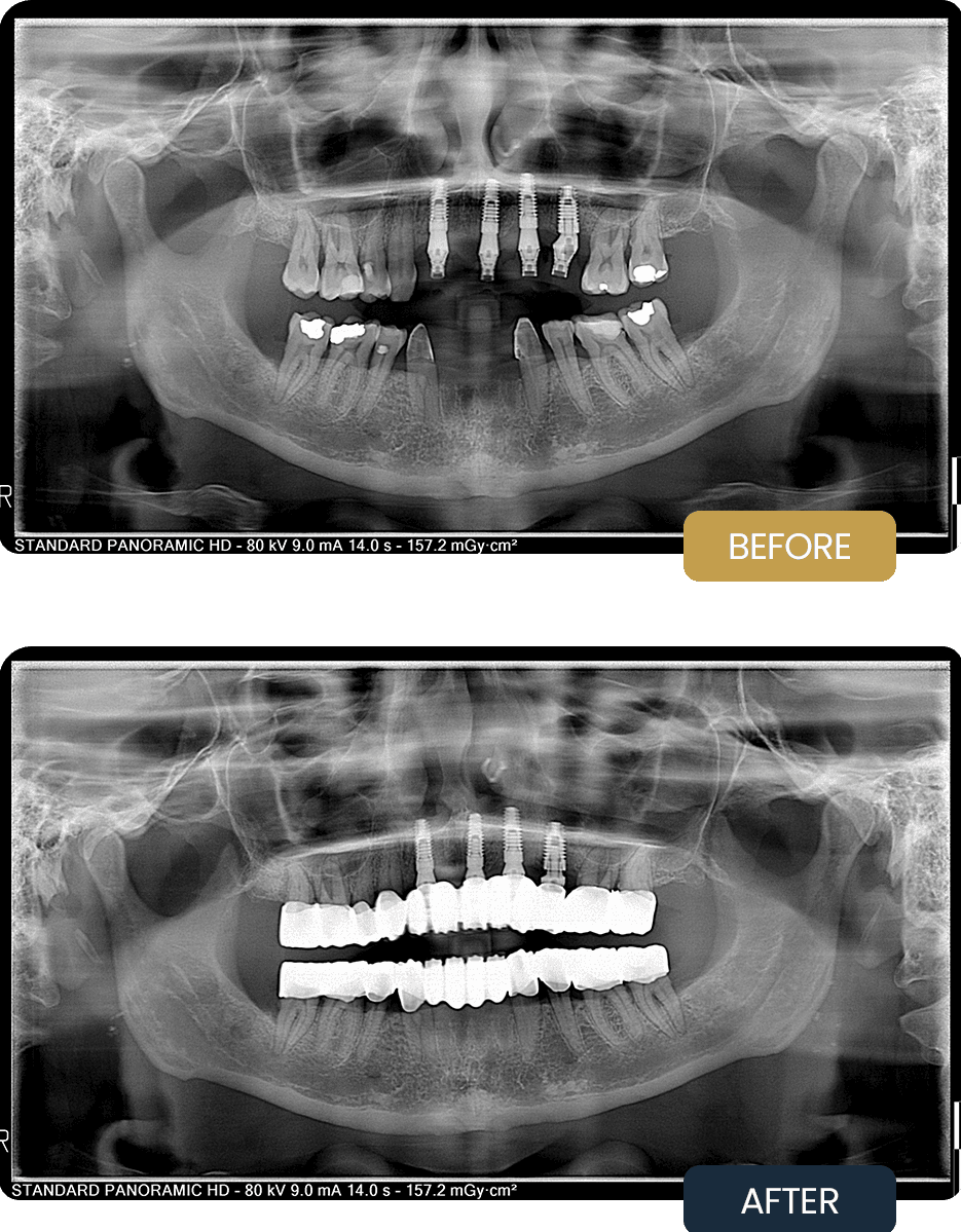 Post treatment panoramic imaging confirmed stable, well integrated implants supporting the final restorations. The zirconium crowns provided a uniform, natural looking smile with improved function, proper occlusion, and enhanced long term comfort.