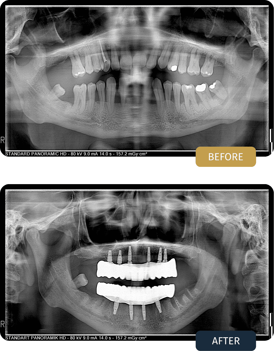 Clinical examination and panoramic imaging confirmed that a full arch implant solution was required in both jaws to restore long term stability, function, and comfort.