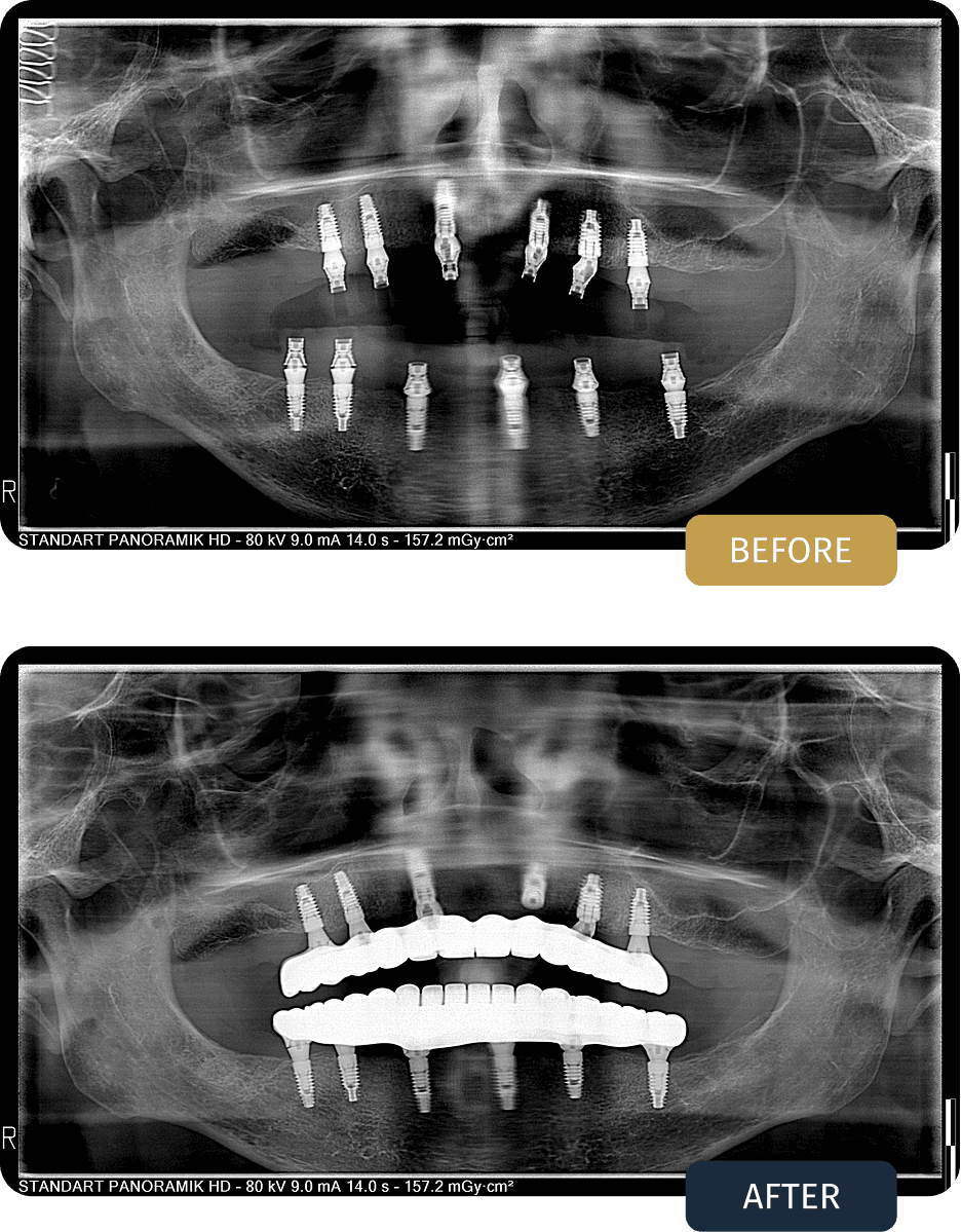 Clinical examination and imaging showed significant tooth loss in both jaws. In the upper jaw, reduced bone height in the posterior regions required additional surgical support to allow safe implant placement. A full arch, implant supported treatment plan was created for both jaws, including closed sinus lifting procedures where needed.