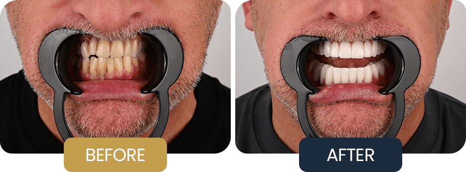 There was clear evidence of bite imbalance and loss of vertical dimension, leading to uneven chewing forces and increased risk of further dental breakdown. Several teeth required extraction due to poor prognosis, while others needed restorative support to prevent future failure.