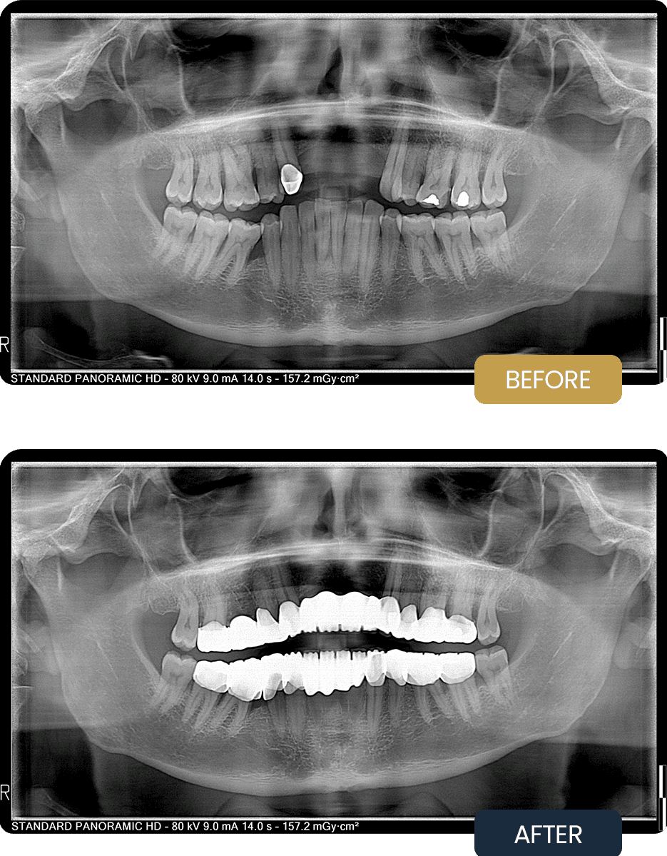 Post treatment panoramic imaging confirmed successful completion of all planned extractions and accurate placement of 25 crowns across both arches.