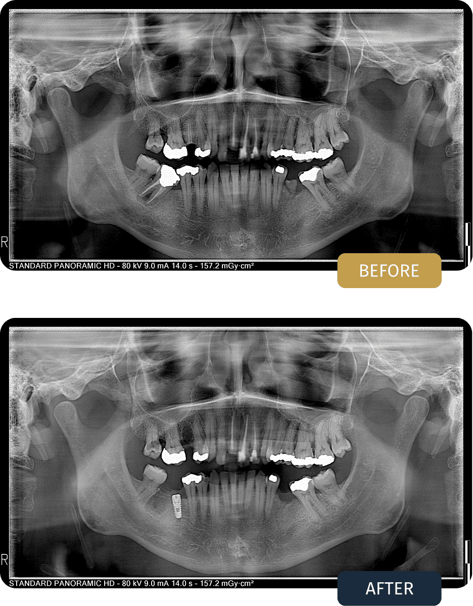 Panoramic imaging revealed widespread restorative needs across both arches, including non restorable teeth requiring extraction and areas where long term support would not be possible without implant placement.