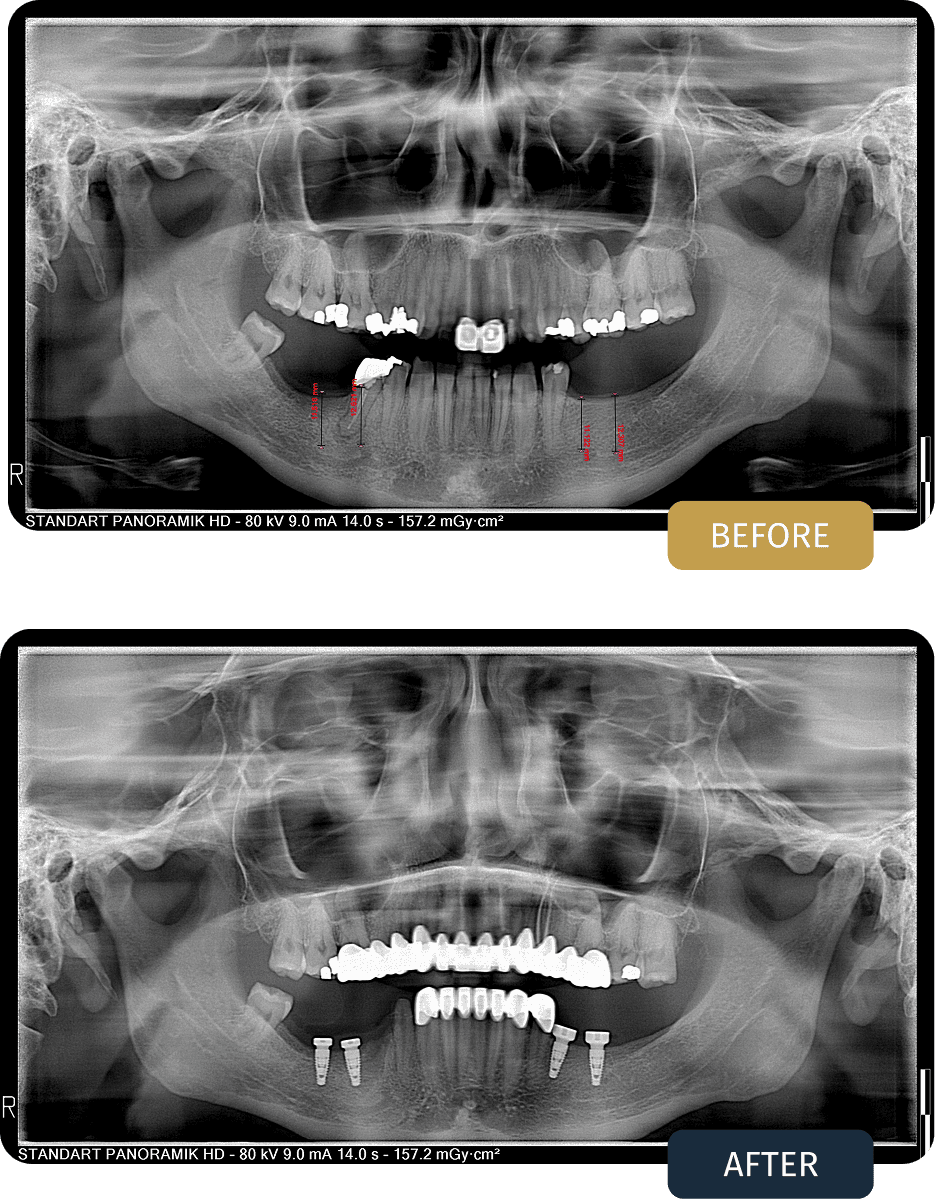 Clinical examination showed that her bone structure was suitable for implant support, while her natural teeth required comprehensive restoration to achieve both functional balance and an improved aesthetic result. A combined implant and crown based solution was planned to restore harmony across the entire smile.