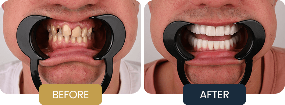 A comprehensive treatment plan was designed to stabilise Rafal’s oral health while preserving natural teeth wherever possible.