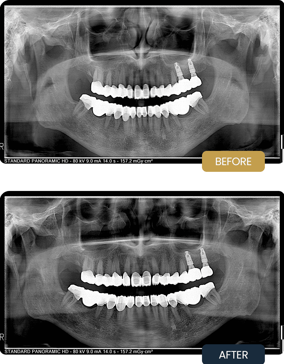Post treatment panoramic imaging confirmed stable implant positioning and well seated new crown restorations with improved occlusal balance. The replaced crowns demonstrated proper alignment and structural integrity.