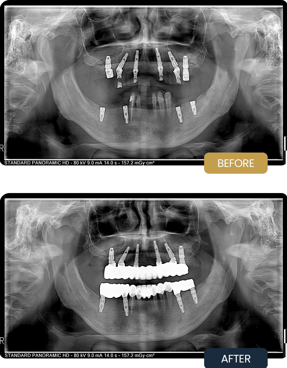 The final prostheses restored proper bite alignment, improved chewing comfort, and delivered a stable, natural looking result with long term functional reliability.