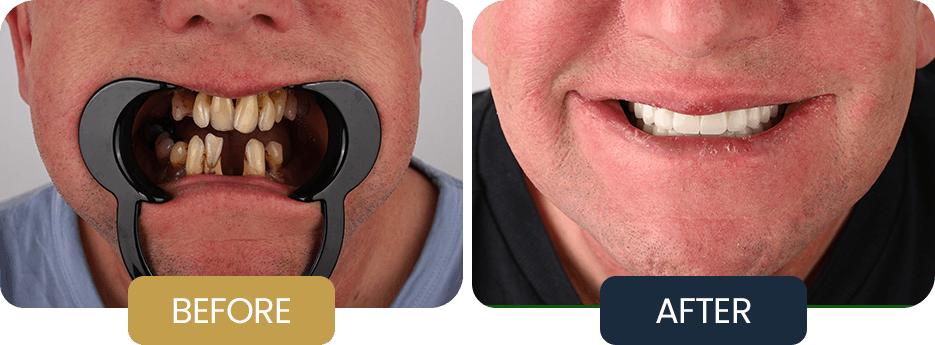 The pre treatment panoramic radiograph illustrates the extent of dental deterioration and confirms the need for full arch implant rehabilitation.